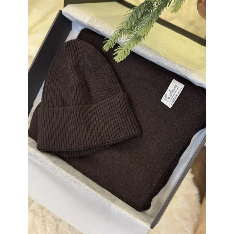 Komplet kaszmirowy czapka szalik ciemny brąz